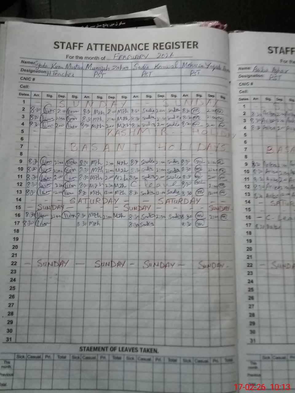 | CNIC | Full Name | Designation | R/C | Absence During Last Calender Month |