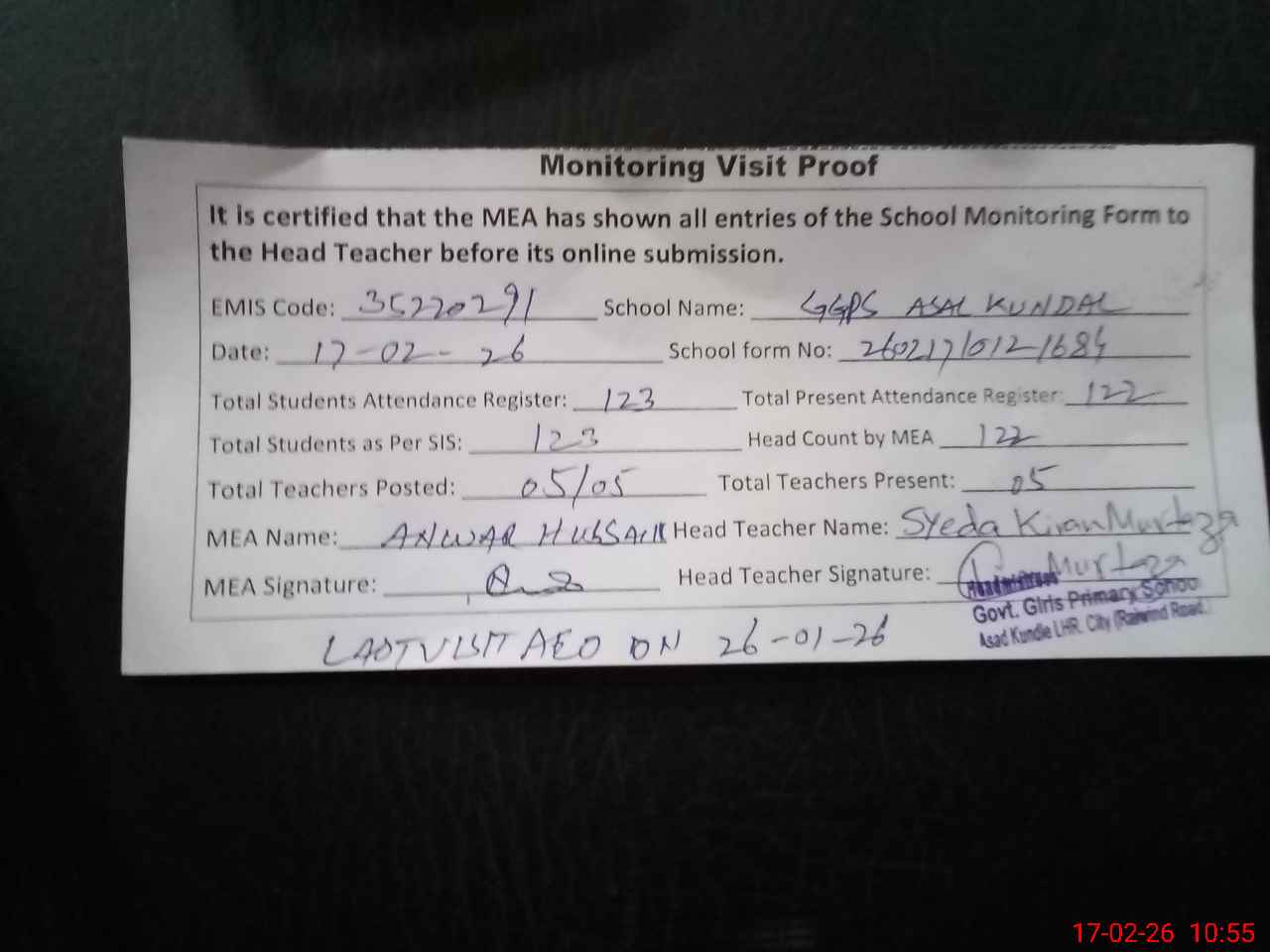| Remarks (Use Separate Page if Required): Last visit AEO and DDEO on 26 January 2026 | |||||