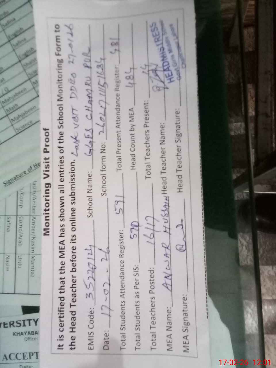 | Attendance Register | Head Teacher | MEA with School | Visit Proof |