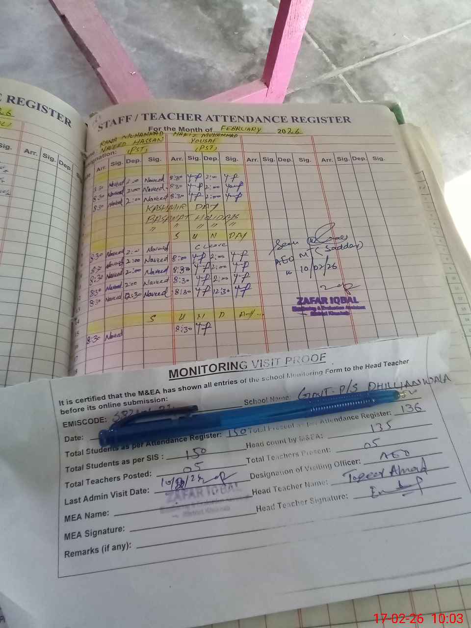 | Remarks (Use Separate Page if Required): last visit AEO 12 Feb 26 Total on register 150 Total on sis 150 | |||||
