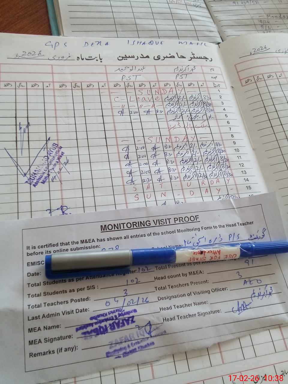 | Remarks (Use Separate Page if Required): last visit AEO 4 Feb 26 Total on register 102 Total on sis 102 | |||||