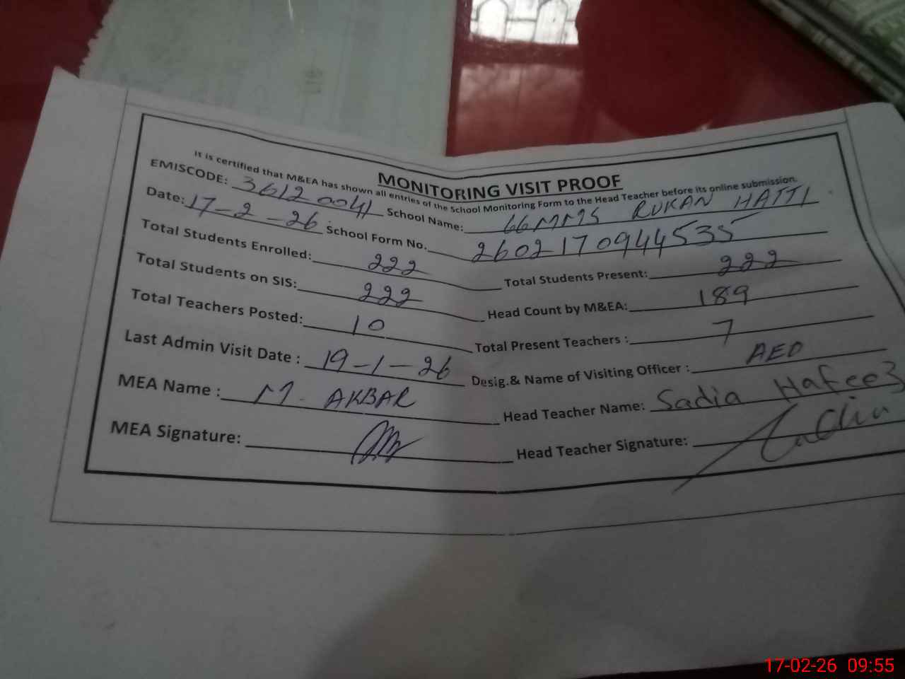 | Attendance Register | Head Teacher | MEA with School | Visit Proof |