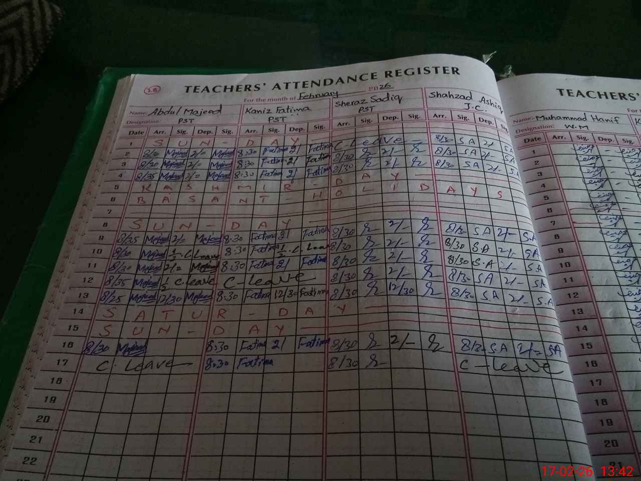 | CNIC | Full Name | Designation | R/C | Absence During Last Calender Month |