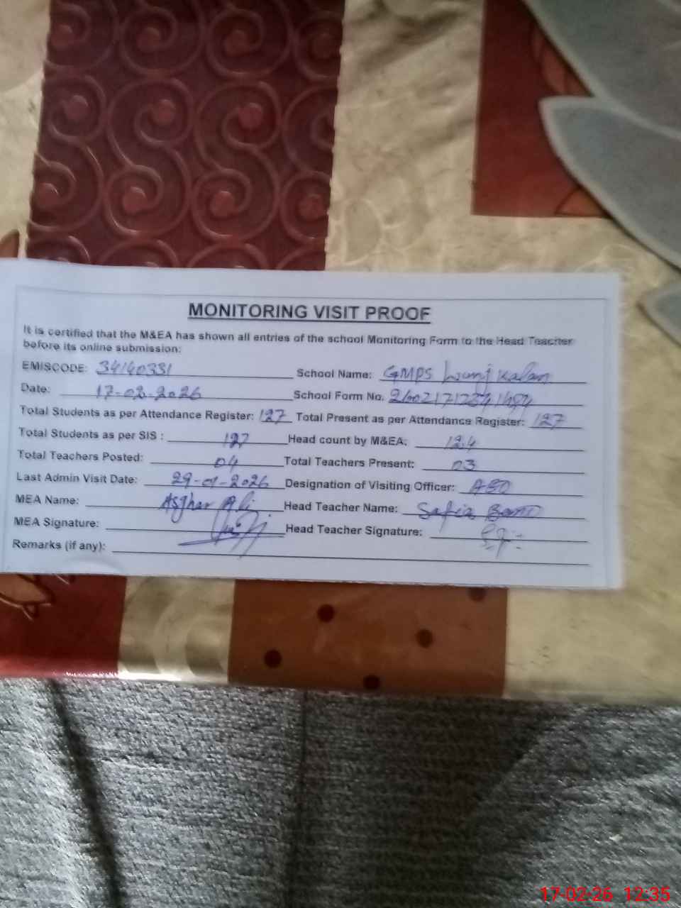 | Attendance Register | Head Teacher | MEA with School | Visit Proof |