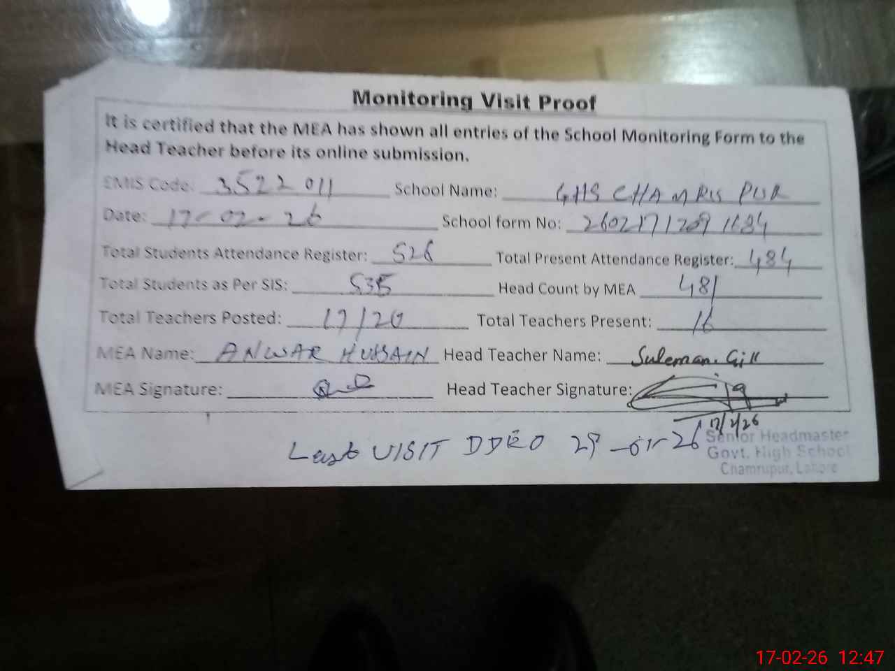 | Attendance Register | Head Teacher | MEA with School | Visit Proof |
