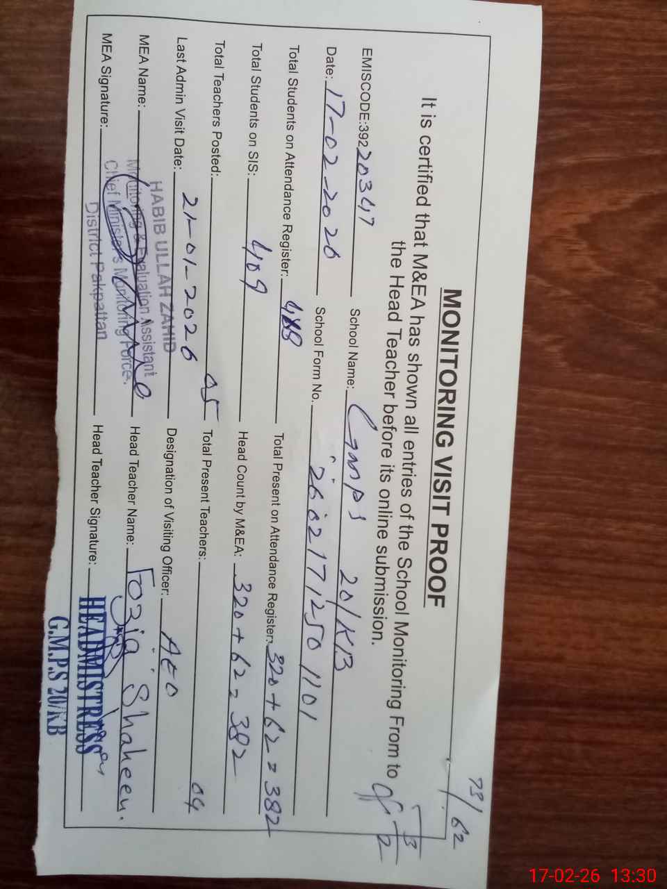 | EMIS Code: 39220347 | Name of School: GMPS CHAK NO. 20 KB | |||