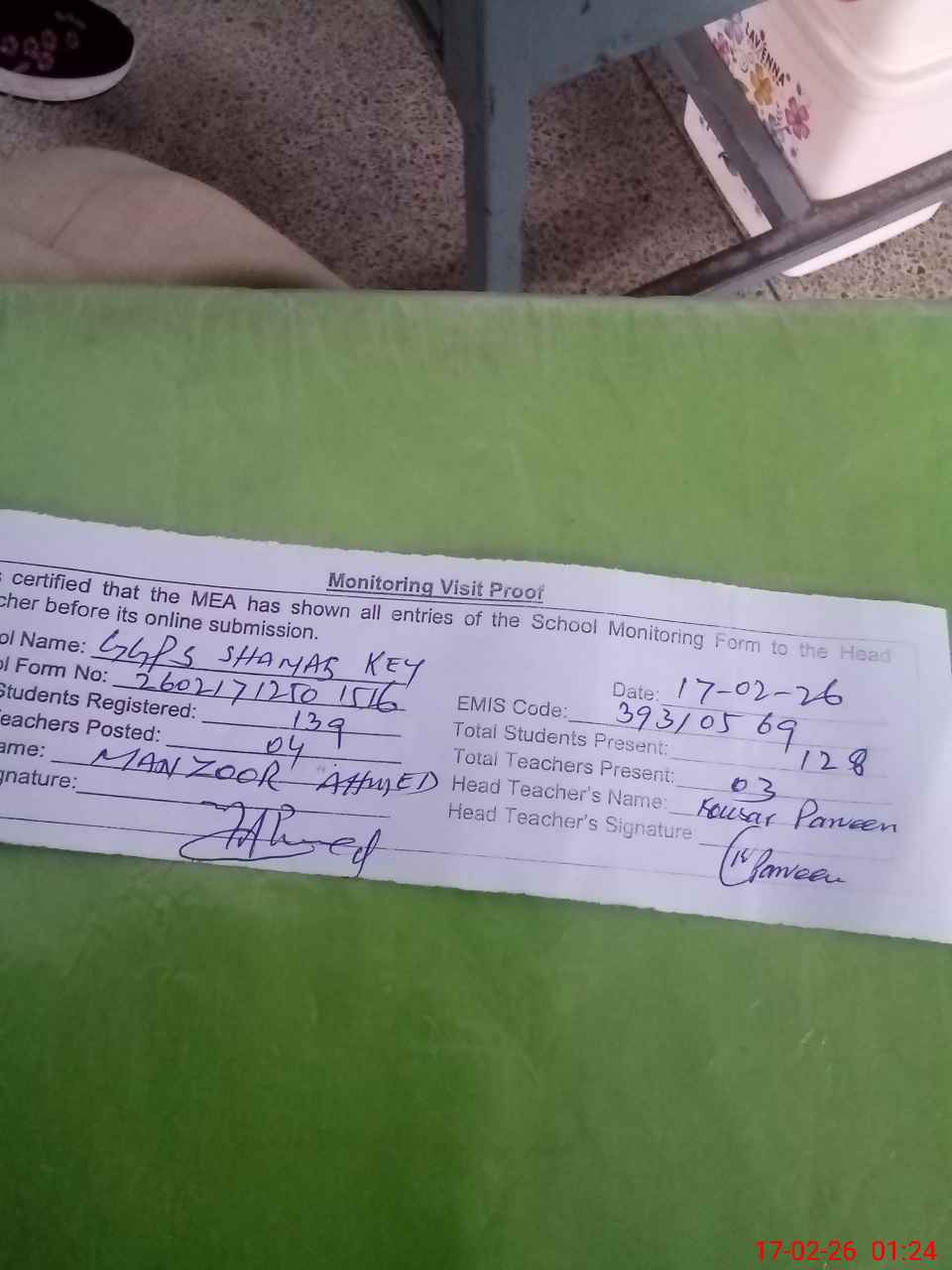 | Attendance Register | Head Teacher | MEA with School | Visit Proof |