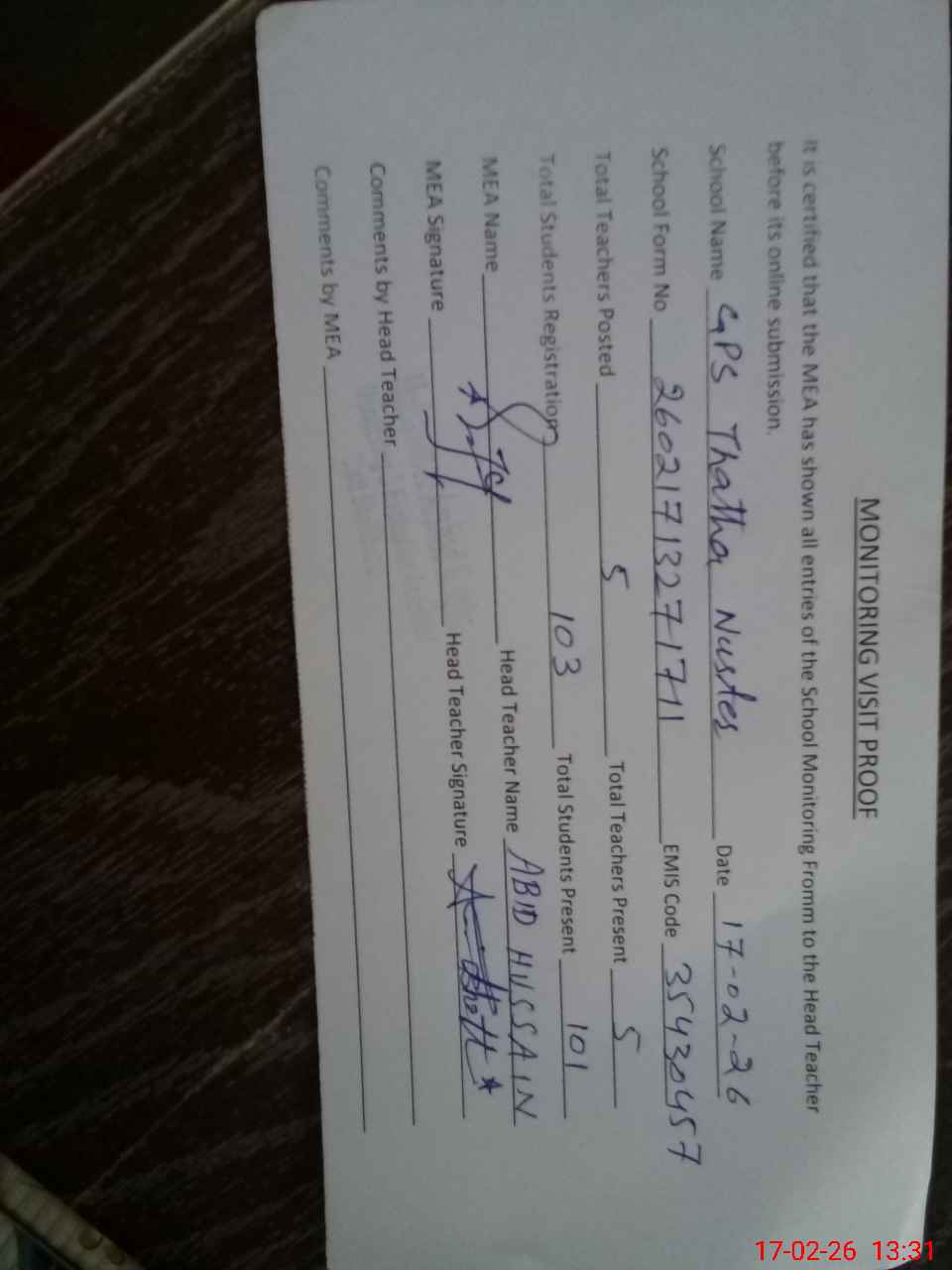 | Attendance Register | Head Teacher | MEA with School | Visit Proof |