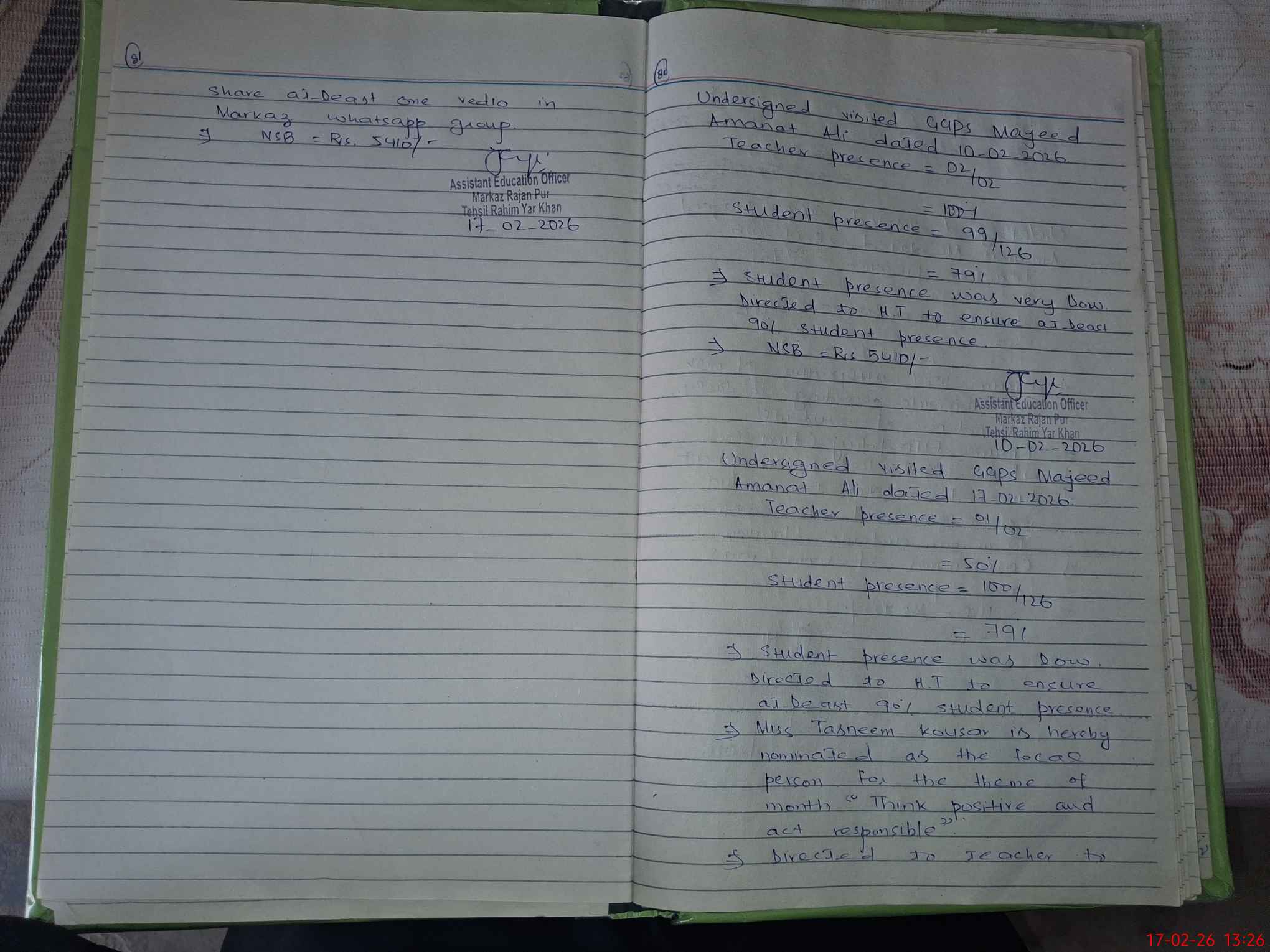 | Attendance Register | Head Teacher | MEA with School | Visit Proof |
