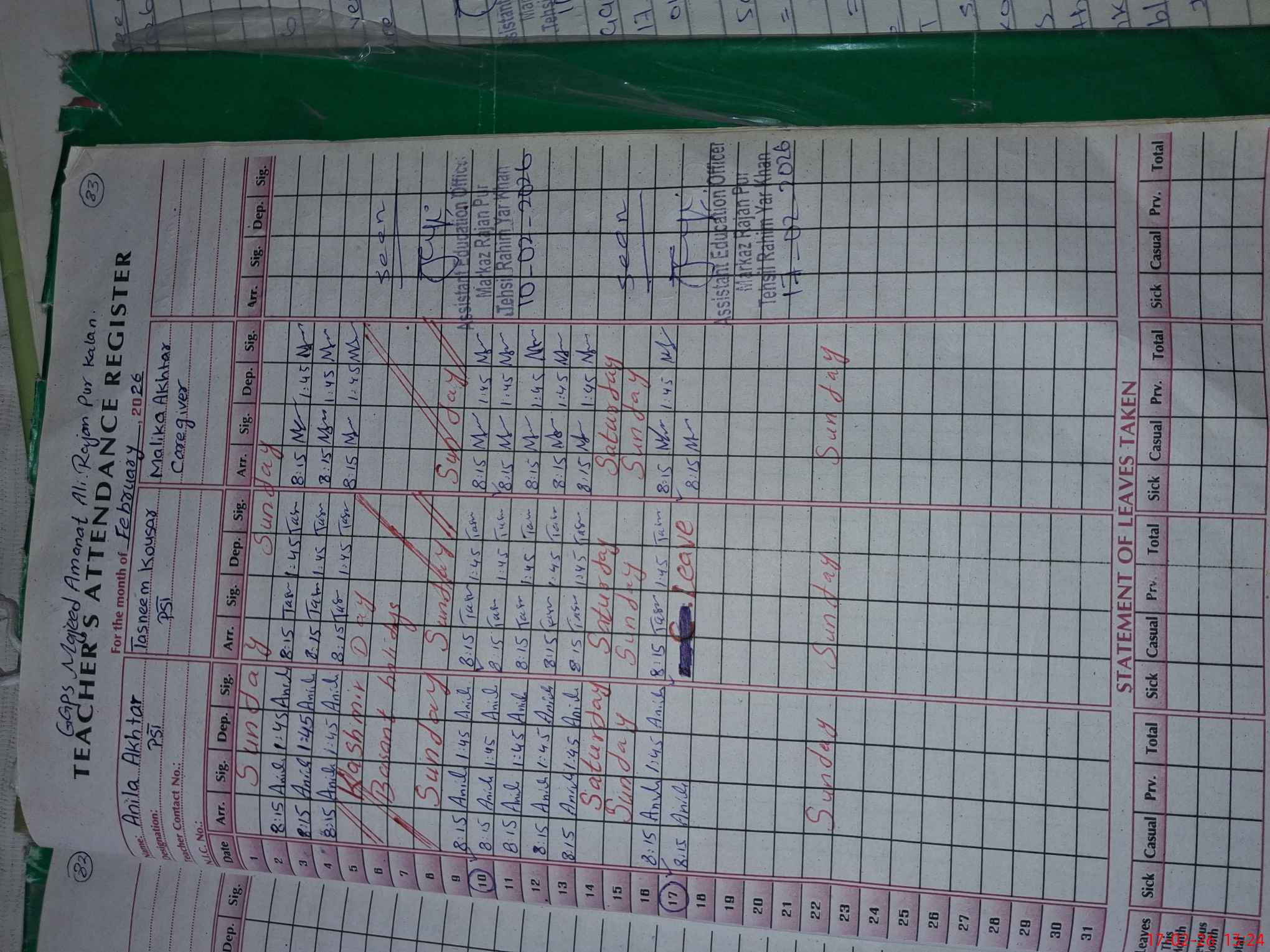 | CNIC | Full Name | Designation | R/C | Absence During Last Calender Month |