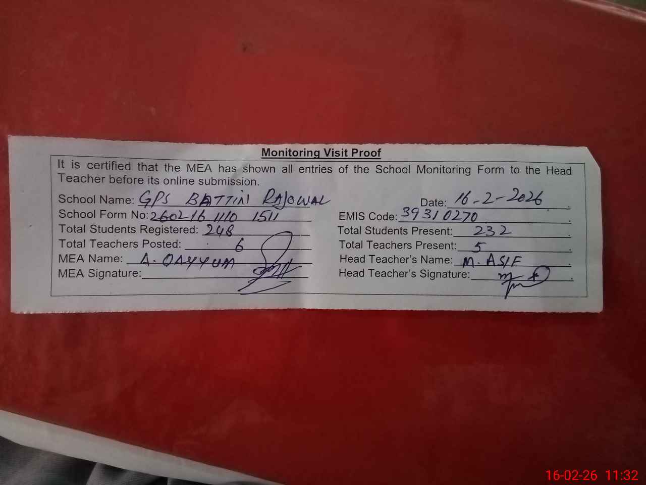 | EMIS Code: 39310270 | Name of School: GPS BATTIAN RAJOWAL | |||