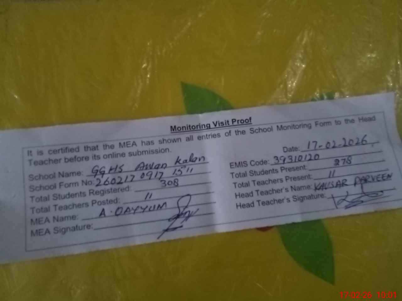 | EMIS Code: 39310120 | Name of School: GGHS AWAN KALAN | |||