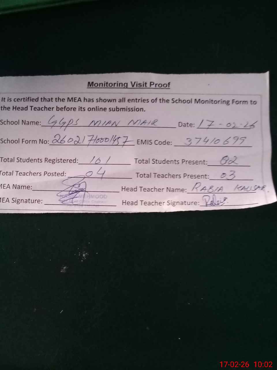 | Attendance Register | Head Teacher | MEA with School | Visit Proof |