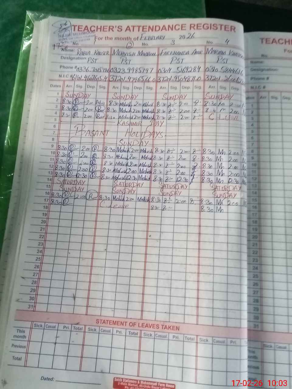 | CNIC | Full Name | Designation | R/C | Absence During Last Calender Month |