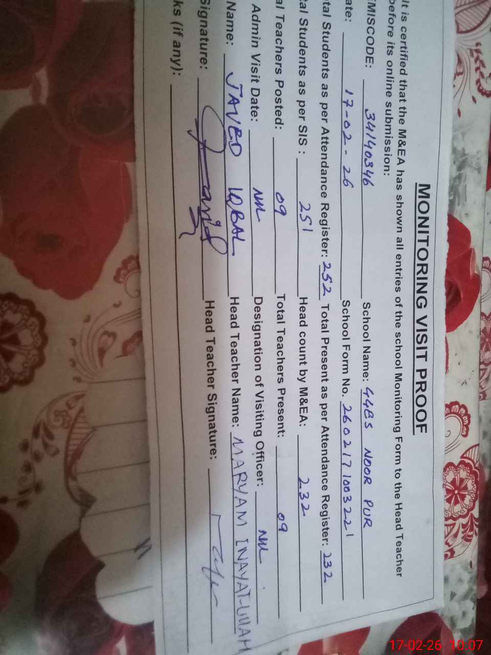 | Certified that this School was Inspected by the Undersigned MEA/DMO Today and the Information Stated Above is as Per Record. | |||||