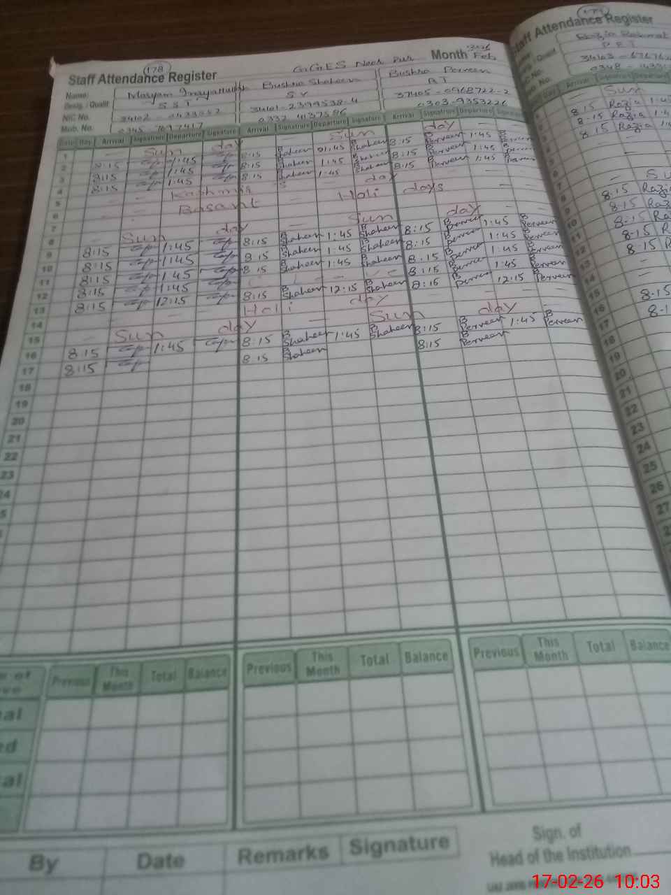 | CNIC | Full Name | Designation | R/C | Absence During Last Calender Month |