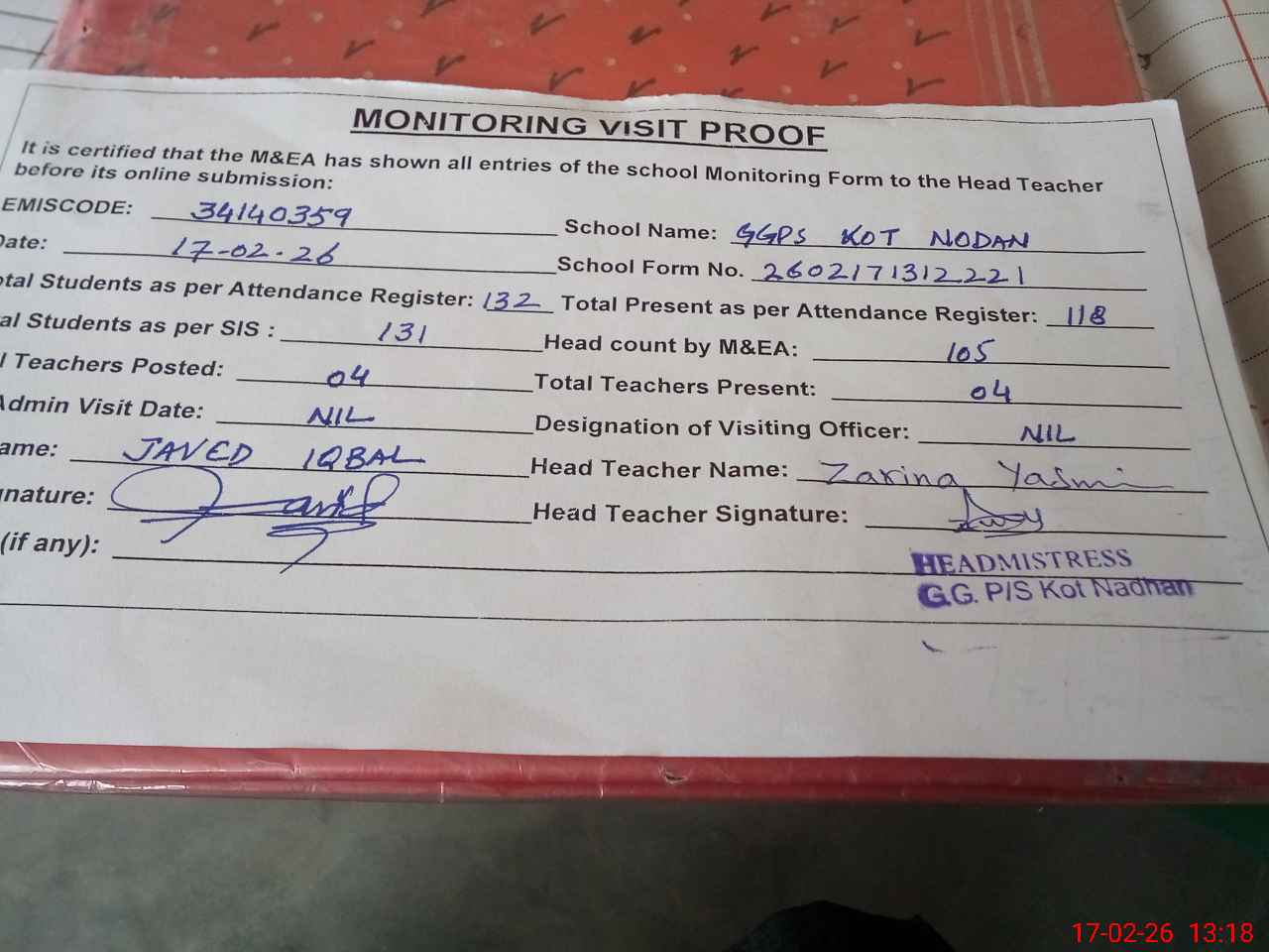 | Attendance Register | Head Teacher | MEA with School | Visit Proof |