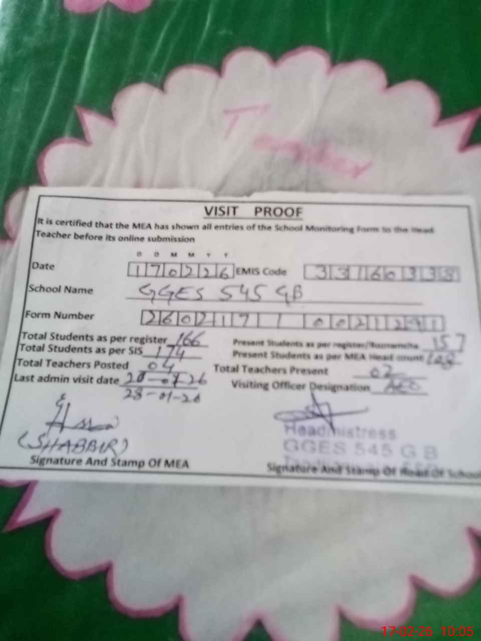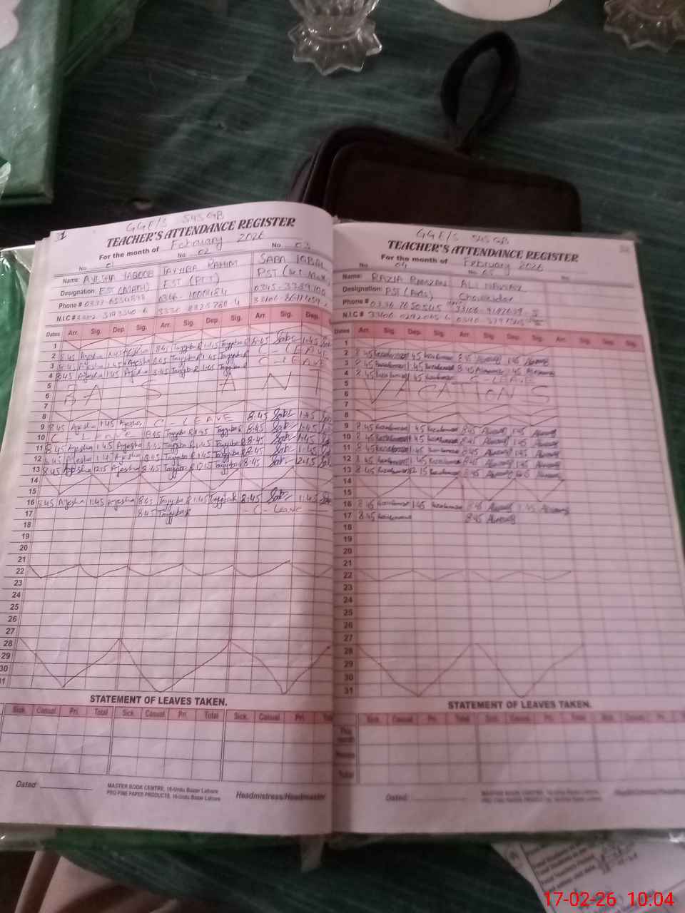 | Remarks (Use Separate Page if Required): H/T AYESHA YAQBOOB EST MATH ARRIVED IN SCHOOL AT 09:11 HRS SO SHE MARKAED ABSENT AS PER SOP STUDENTS ATTANDANC REGESTERS, MARKED THE STUDENTS ATTANDANC UP TO 28TH FEBRUARY. NO SOAP AT HAND WASH POINTS. TOTAL STUDENTS IN REGESTER ARE 166 TOTAL STUDENTS IN SIS ARE. 174 TOTAL STUDENTS AS PER ROZNAMCHA PRESENT 157 STUDENTS HEAD COUNTING AS PER MEA 108 NSB FUND SPENT NOT JUSTIFIED AS WORK DONE SCHOOL COUNCIL MEETING REGESTER NOT AVAILABLE IN THE SCHOOL. DRINKING WATER NONFUNCTIONAL. | |||||