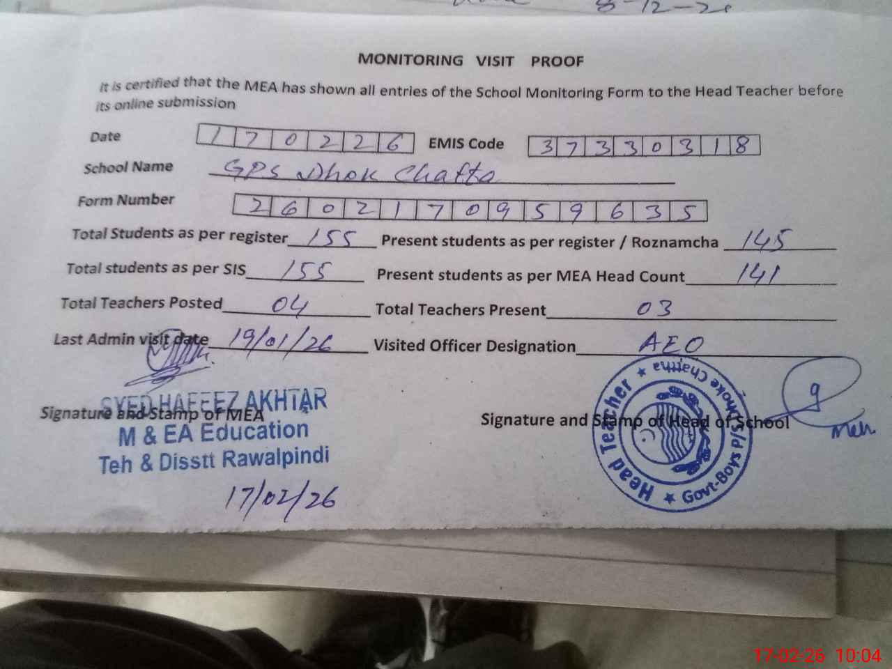 | Monitoring Date: 17-02-2026 | Start Time: 17-02-2026 09:34 AM | End Time: 17-02-2026 10:09 AM | Name of MEA: Sy**** Ha**** Ak**** | |