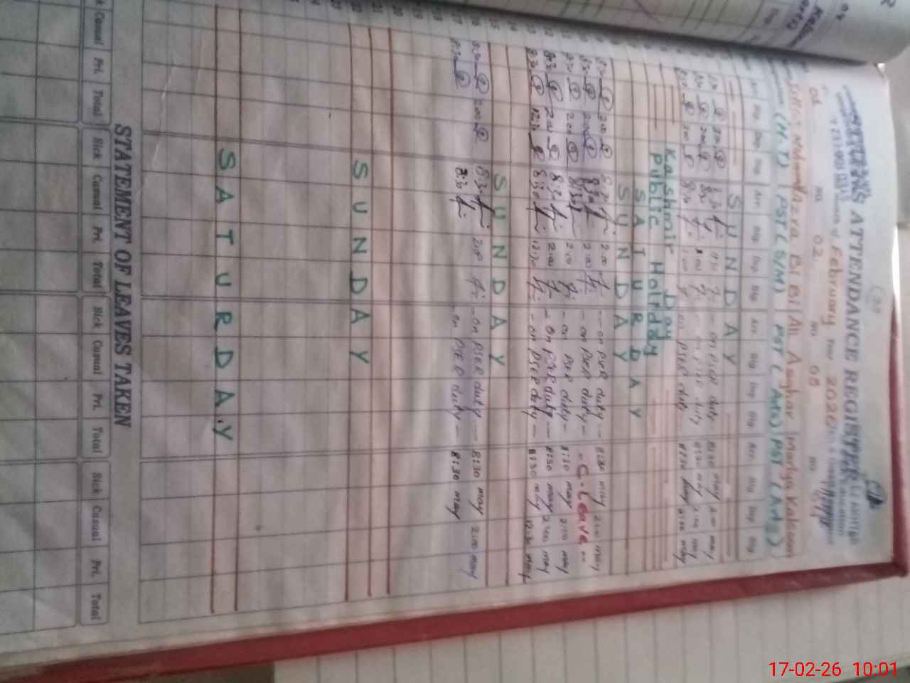 | Leave | Duty | Absent | Maternity | Medical | Ex- Pak |