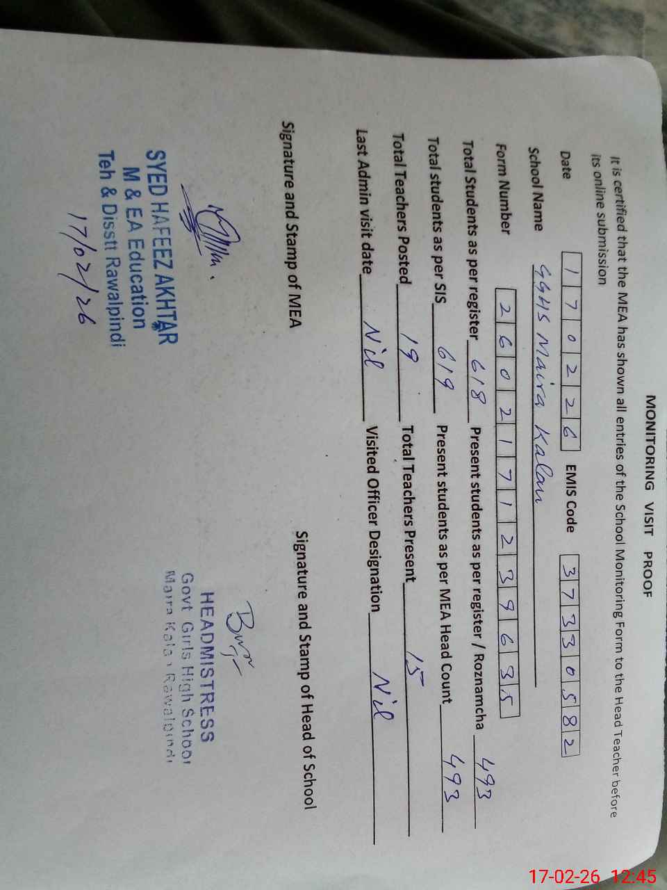 | EMIS Code: 37330582 | Name of School: GGHS MAIRA KALAN (CONTROLED BY CANTONMENT BOARD) | |||