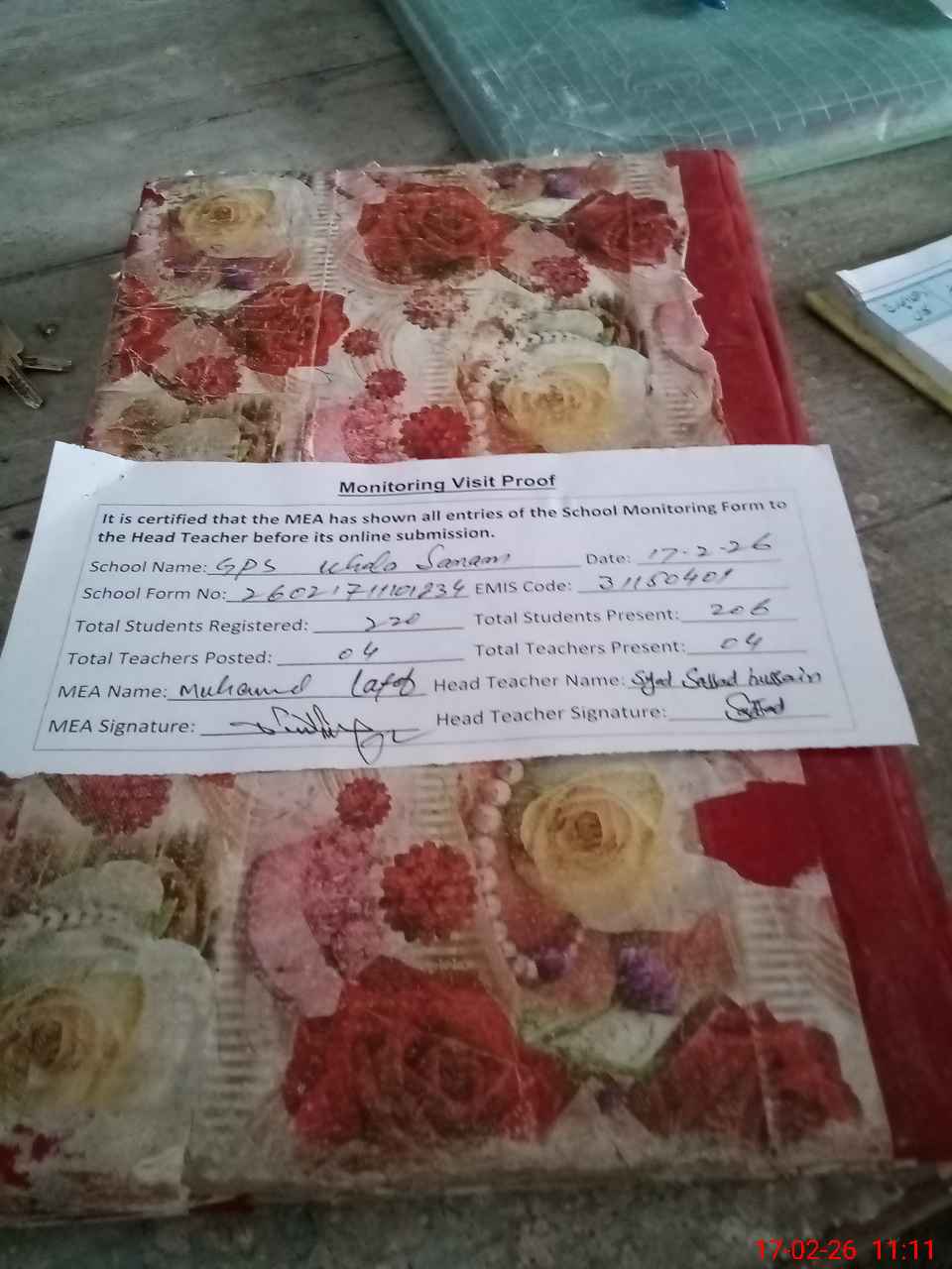 | Attendance Register | Head Teacher | MEA with School | Visit Proof |