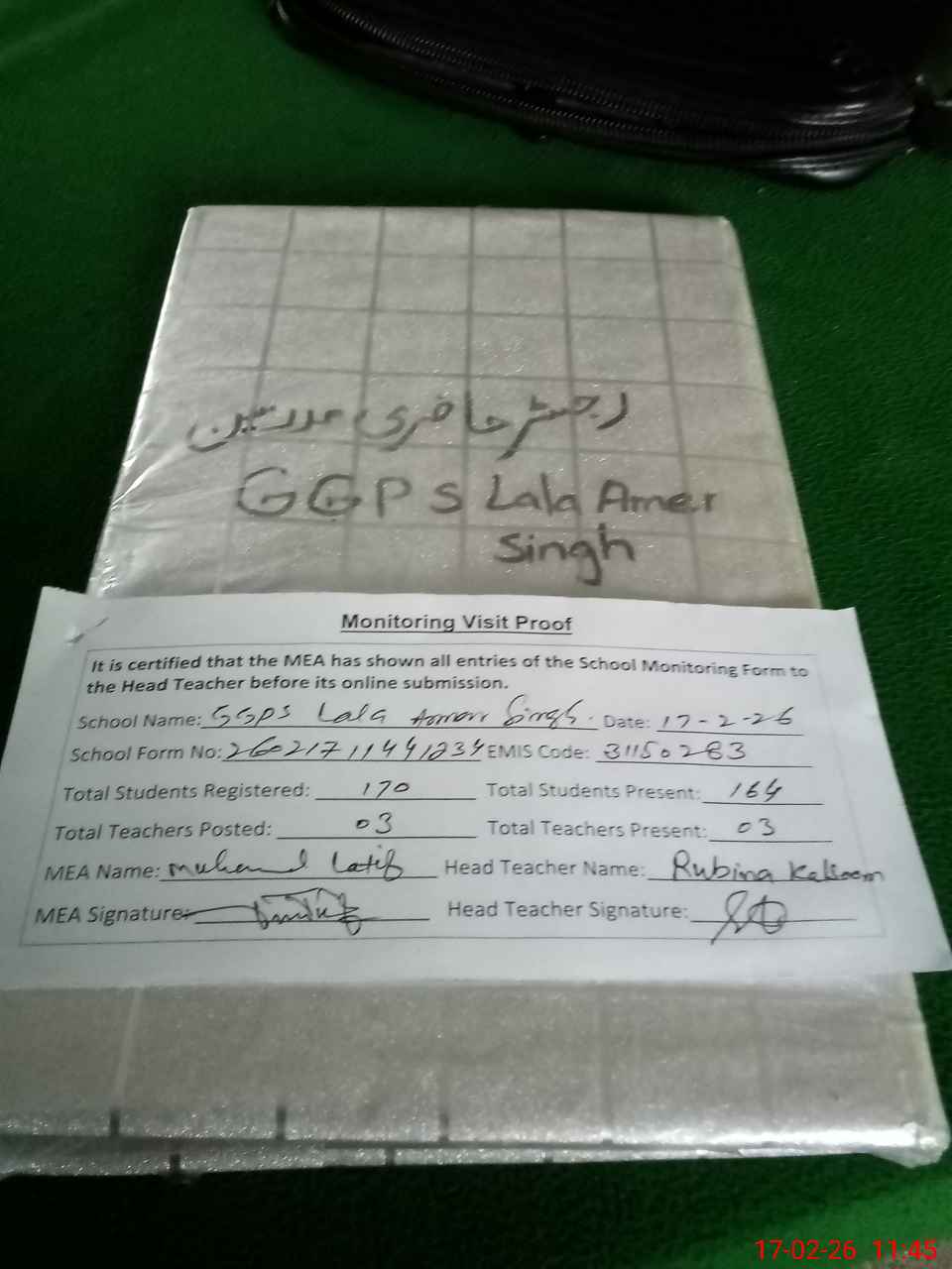 | Attendance Register | Head Teacher | MEA with School | Visit Proof |