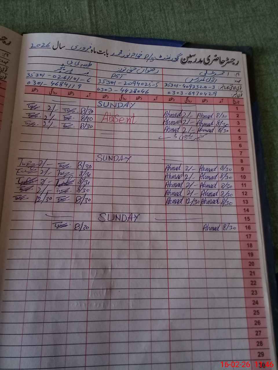 | CNIC | Full Name | Designation | R/C | Absence During Last Calender Month |