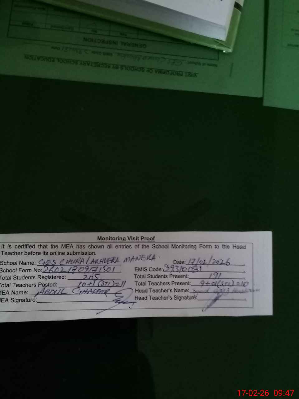 | Certified that this School was Inspected by the Undersigned MEA/DMO Today and the Information Stated Above is as Per Record. | |||||