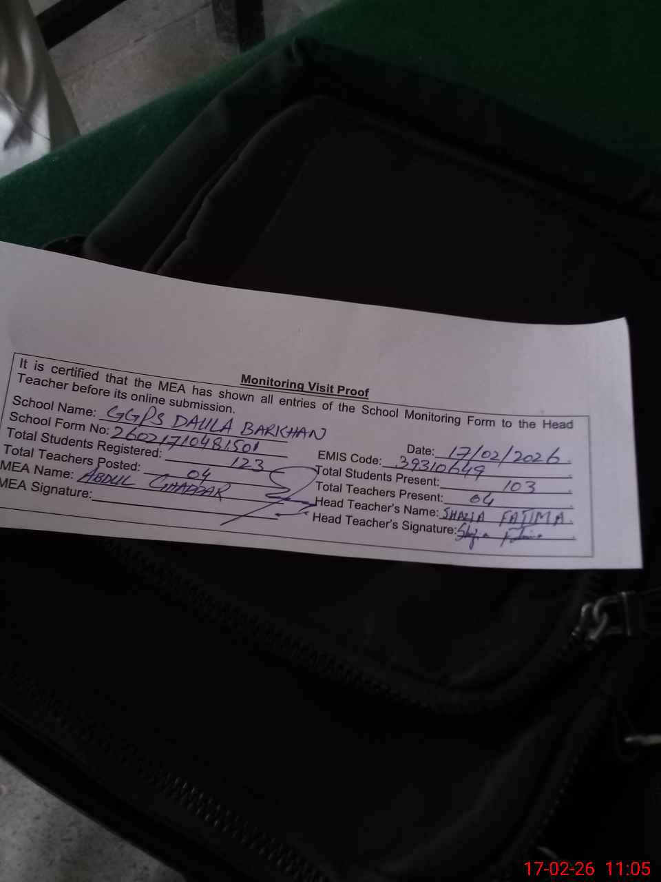 | Attendance Register | Head Teacher | MEA with School | Visit Proof |
