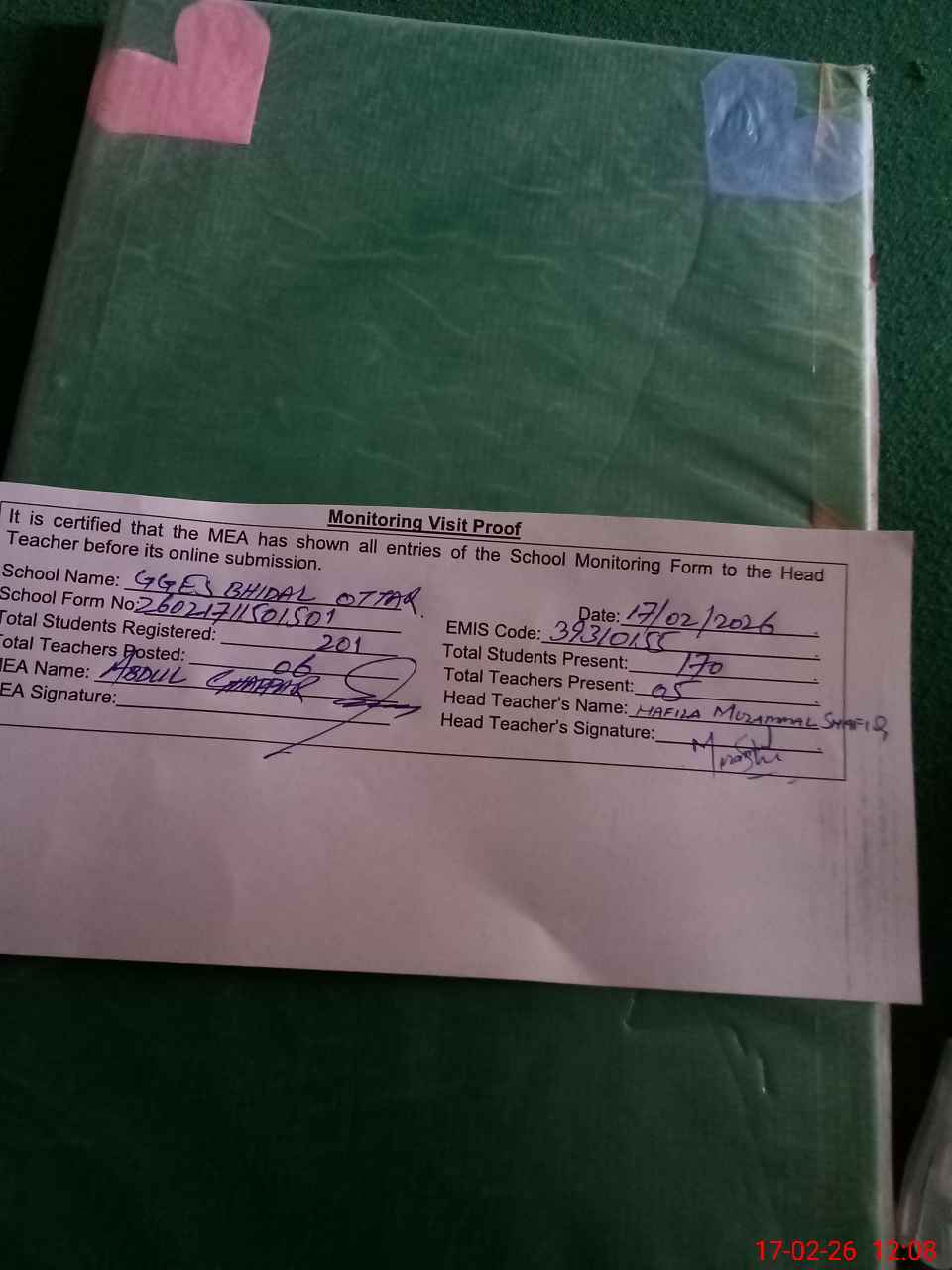 | Attendance Register | Head Teacher | MEA with School | Visit Proof |