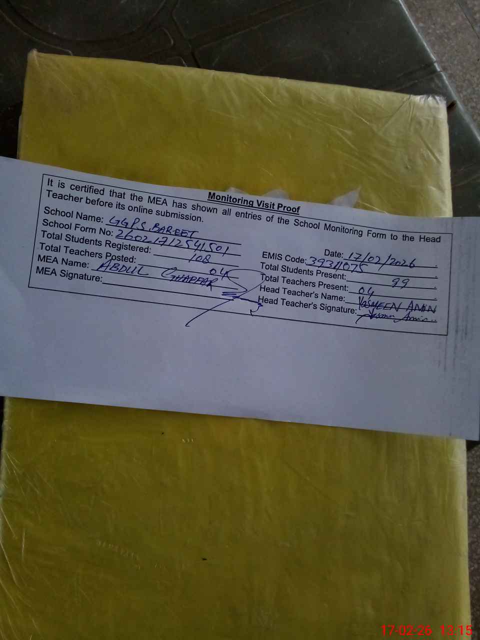 | EMIS Code: 39311075 | Name of School: GGPS BAREET JAHANGIR | |||