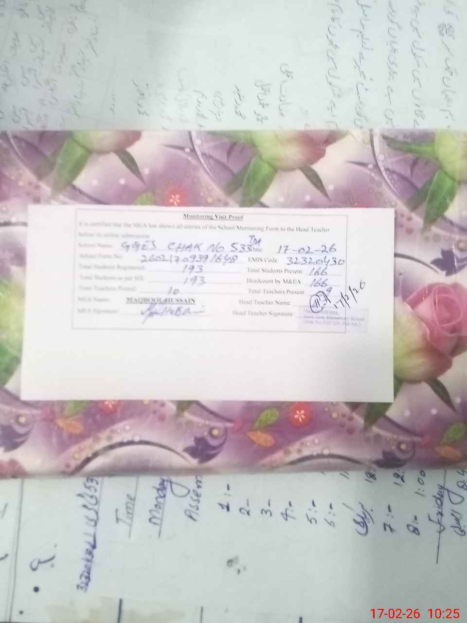 | Attendance Register | Head Teacher | MEA with School | Visit Proof |