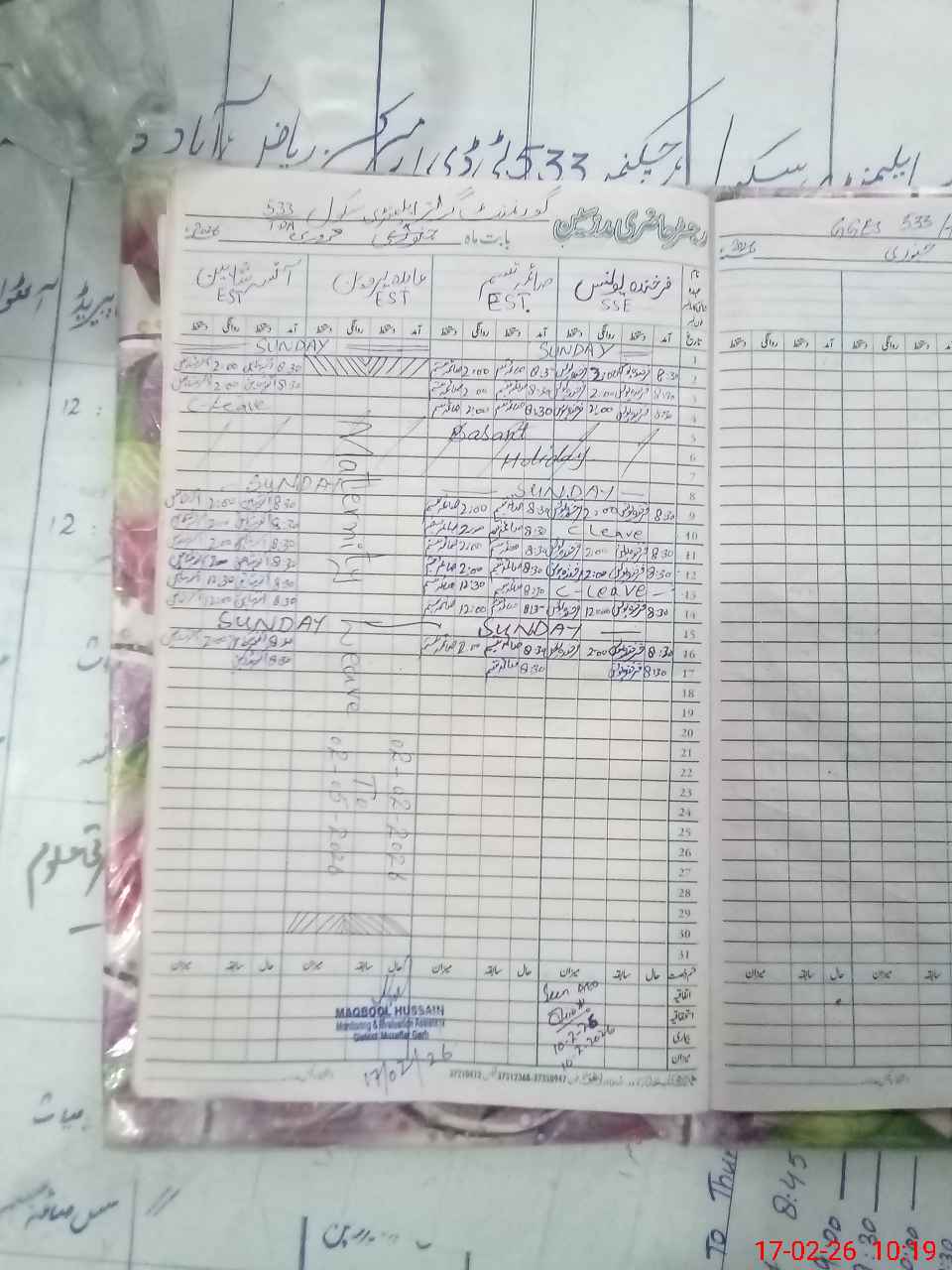 | CNIC | Full Name | Designation | R/C | Absence During Last Calender Month |