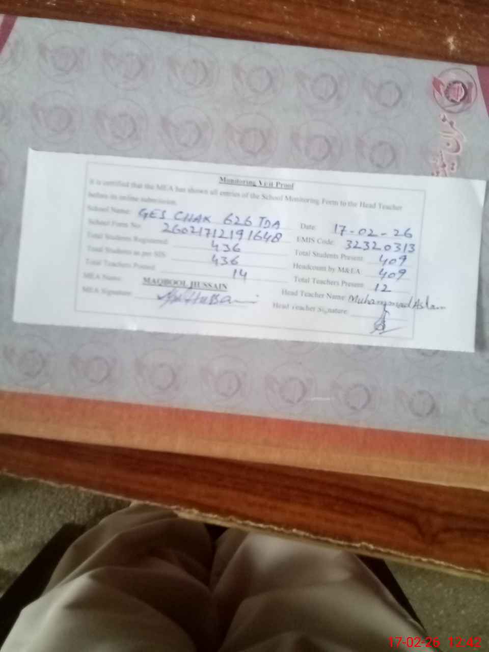 | Attendance Register | Head Teacher | MEA with School | Visit Proof |