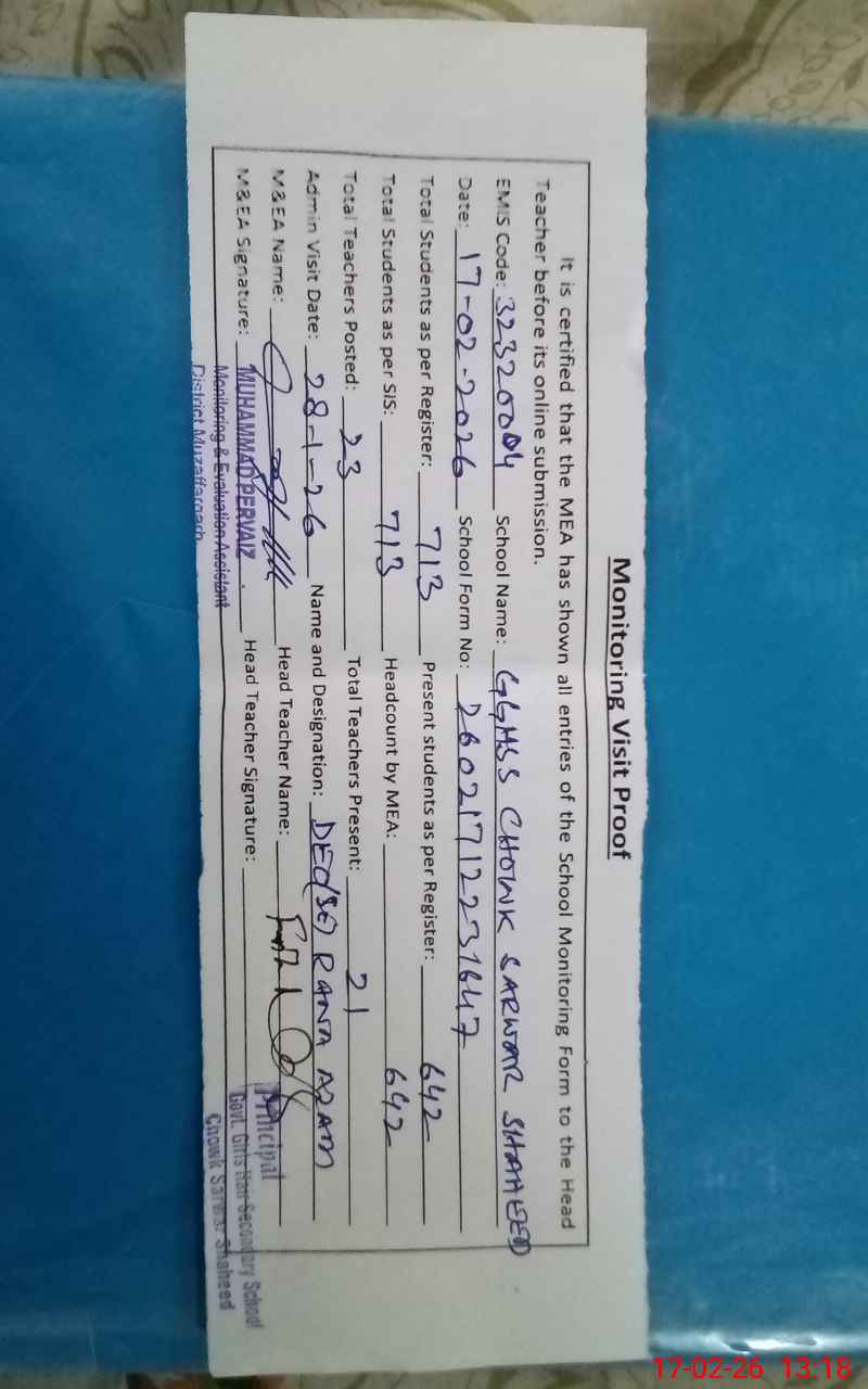 | EMIS Code: 32320004 | Name of School: GGHSS CHOWK SARWAR SHAHEED | |||