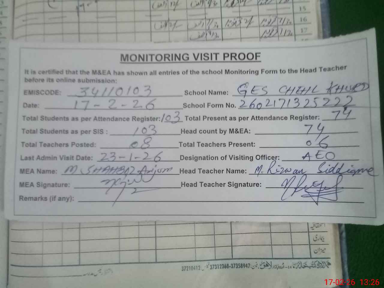 | Attendance Register | Head Teacher | MEA with School | Visit Proof |