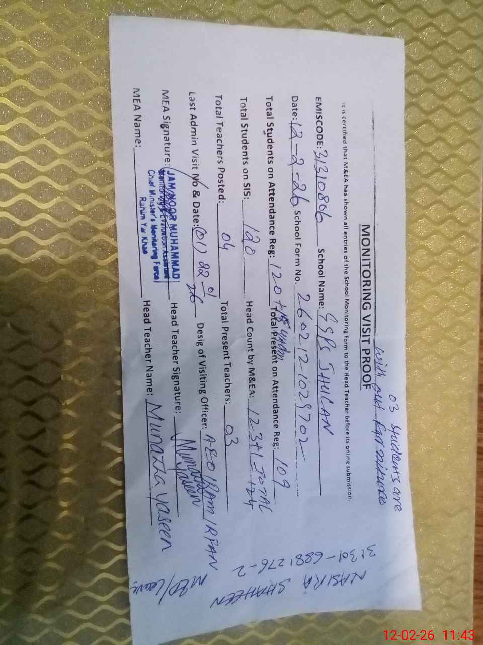 | Attendance Register | Head Teacher | MEA with School | Visit Proof |