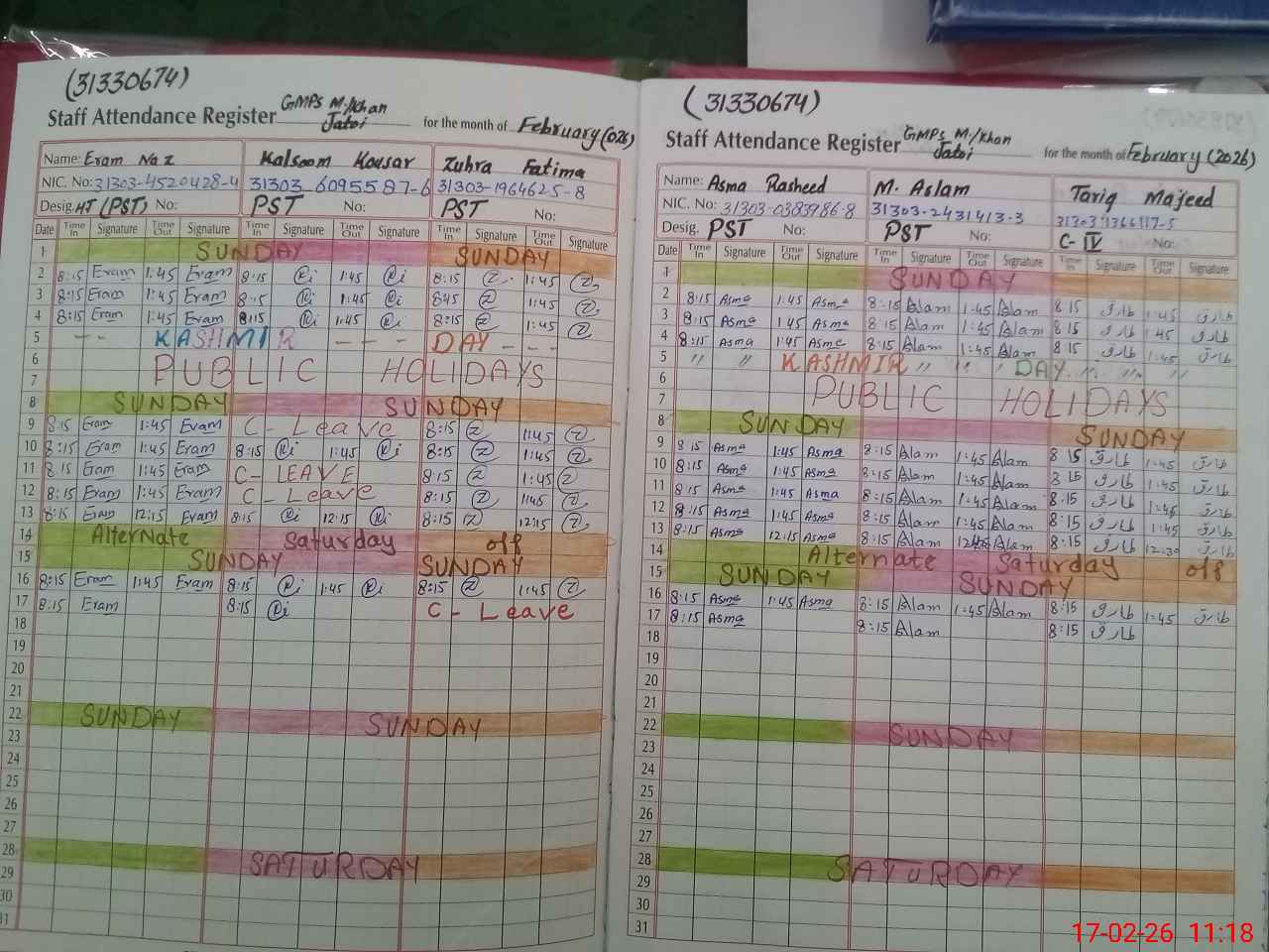 | CNIC | Full Name | Designation | R/C | Absence During Last Calender Month |