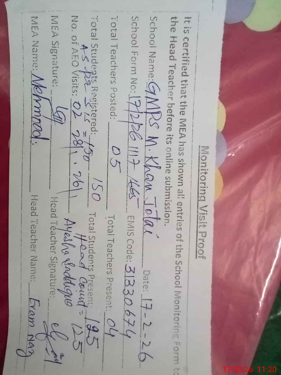 | Attendance Register | Head Teacher | MEA with School | Visit Proof |