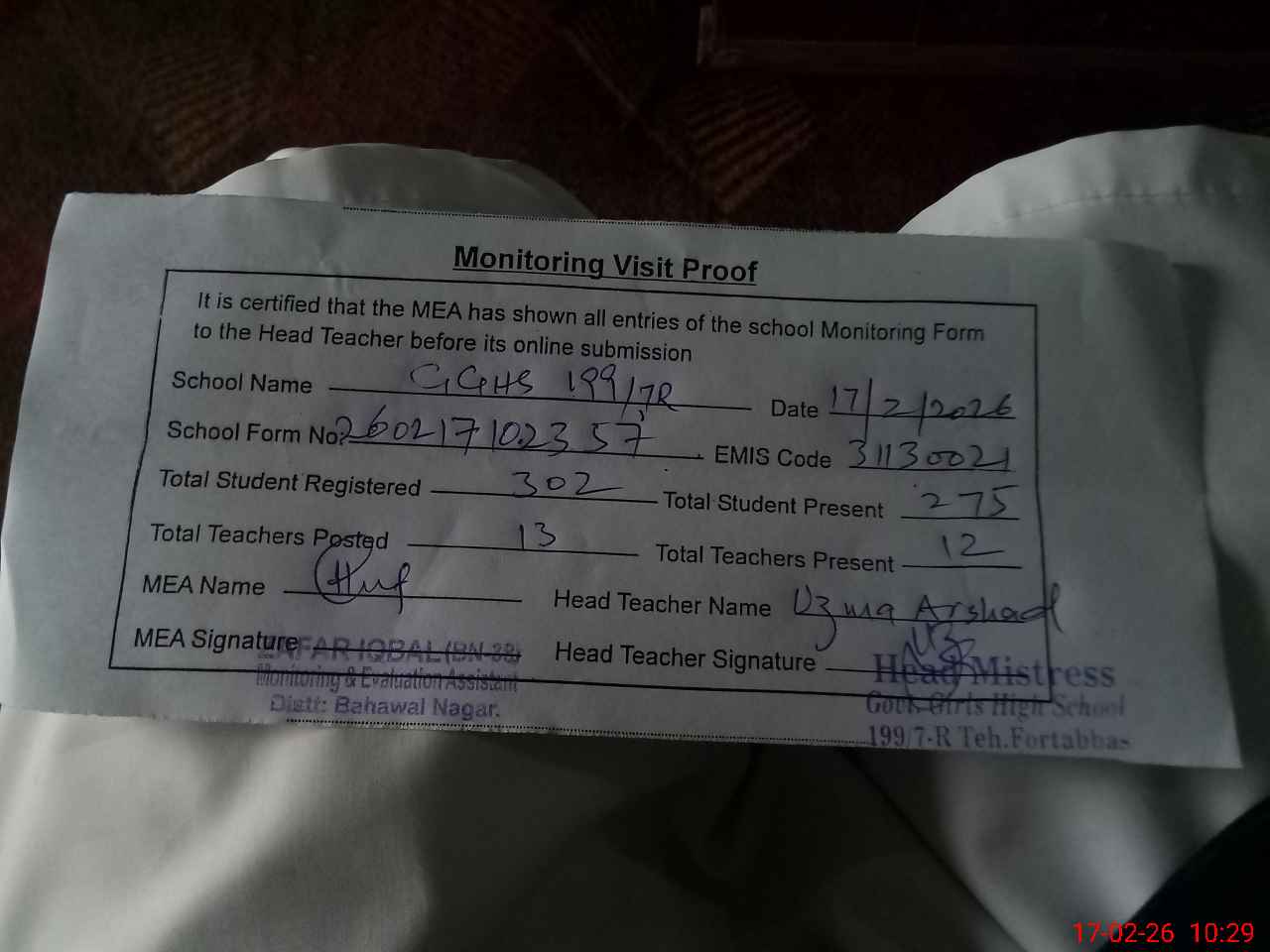 | Monitoring Date: 17-02-2026 | Start Time: 17-02-2026 10:10 AM | End Time: 17-02-2026 10:29 AM | Name of MEA: Za**** Iq**** BN**** | |
