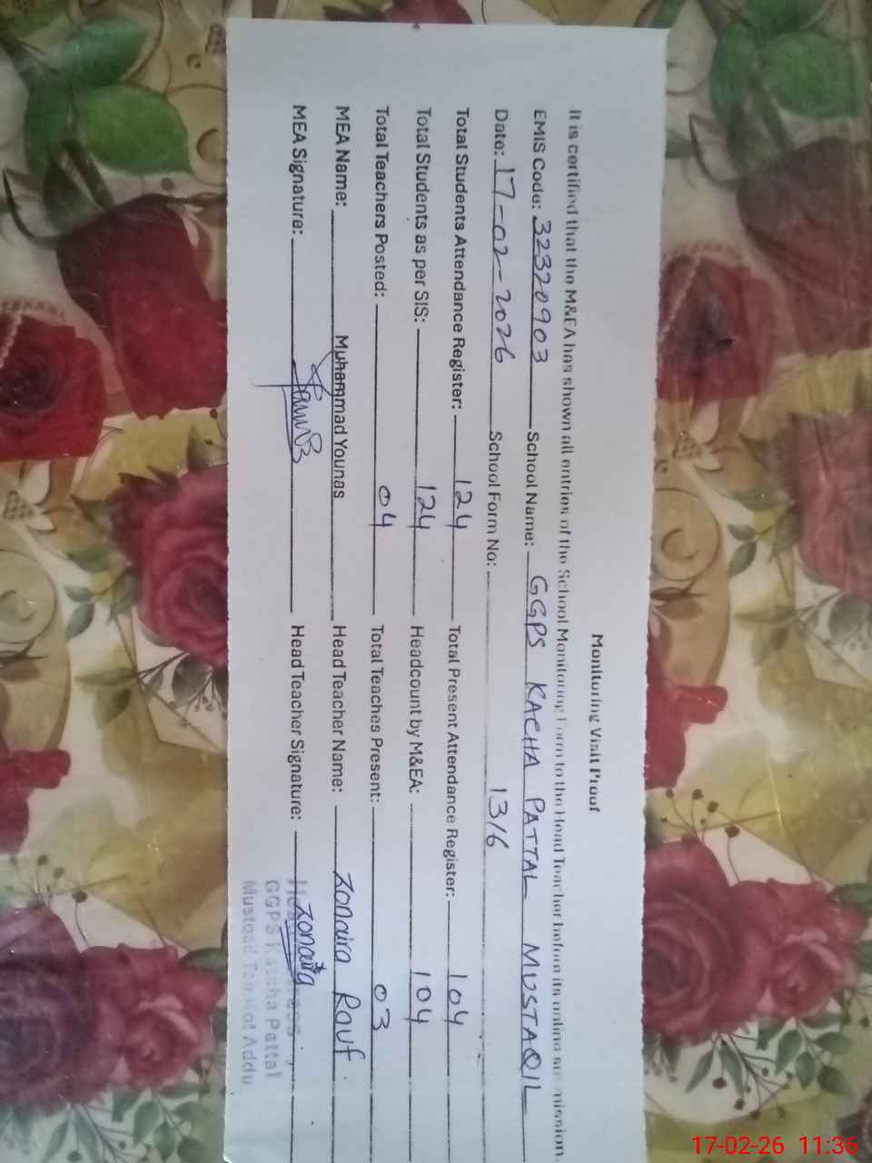 | Attendance Register | Head Teacher | MEA with School | Visit Proof |