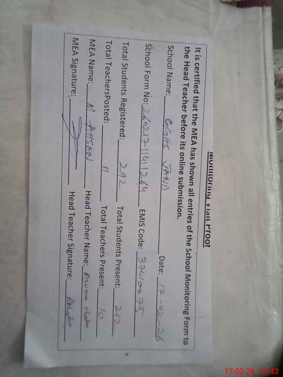 | Attendance Register | Head Teacher | MEA with School | Visit Proof |