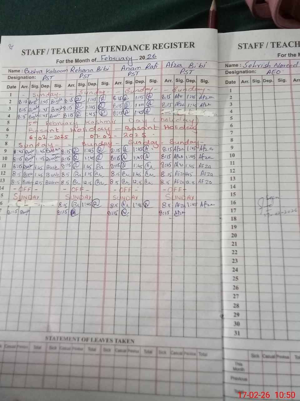 | CNIC | Full Name | Designation | R/C | Absence During Last Calender Month |
