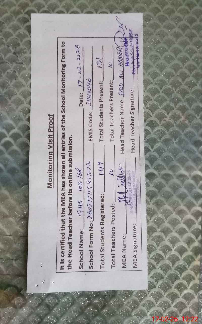 | EMIS Code: 31140046 | Name of School: GHS CHAK NO. 103/6-R | |||