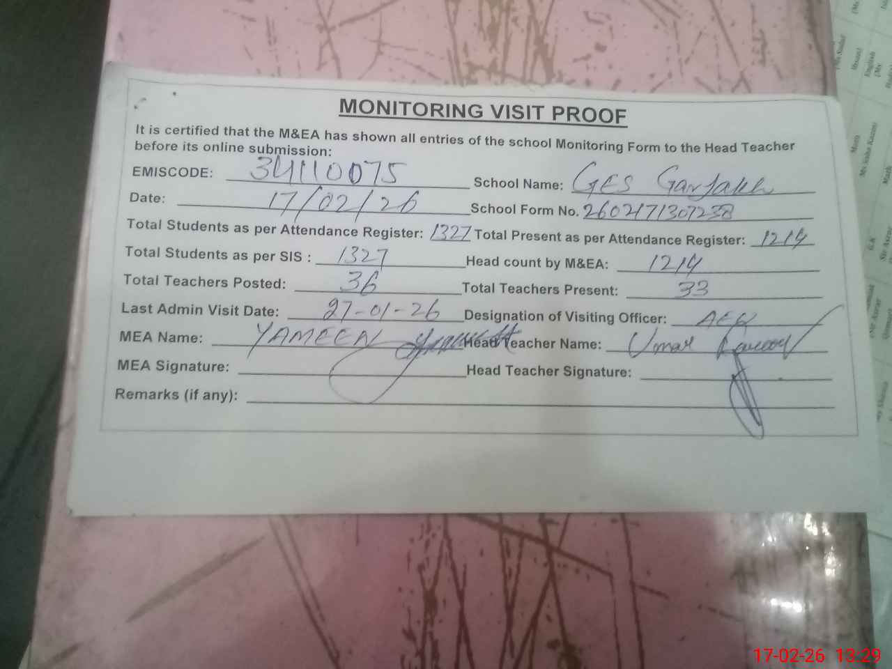 | Attendance Register | Head Teacher | MEA with School | Visit Proof |