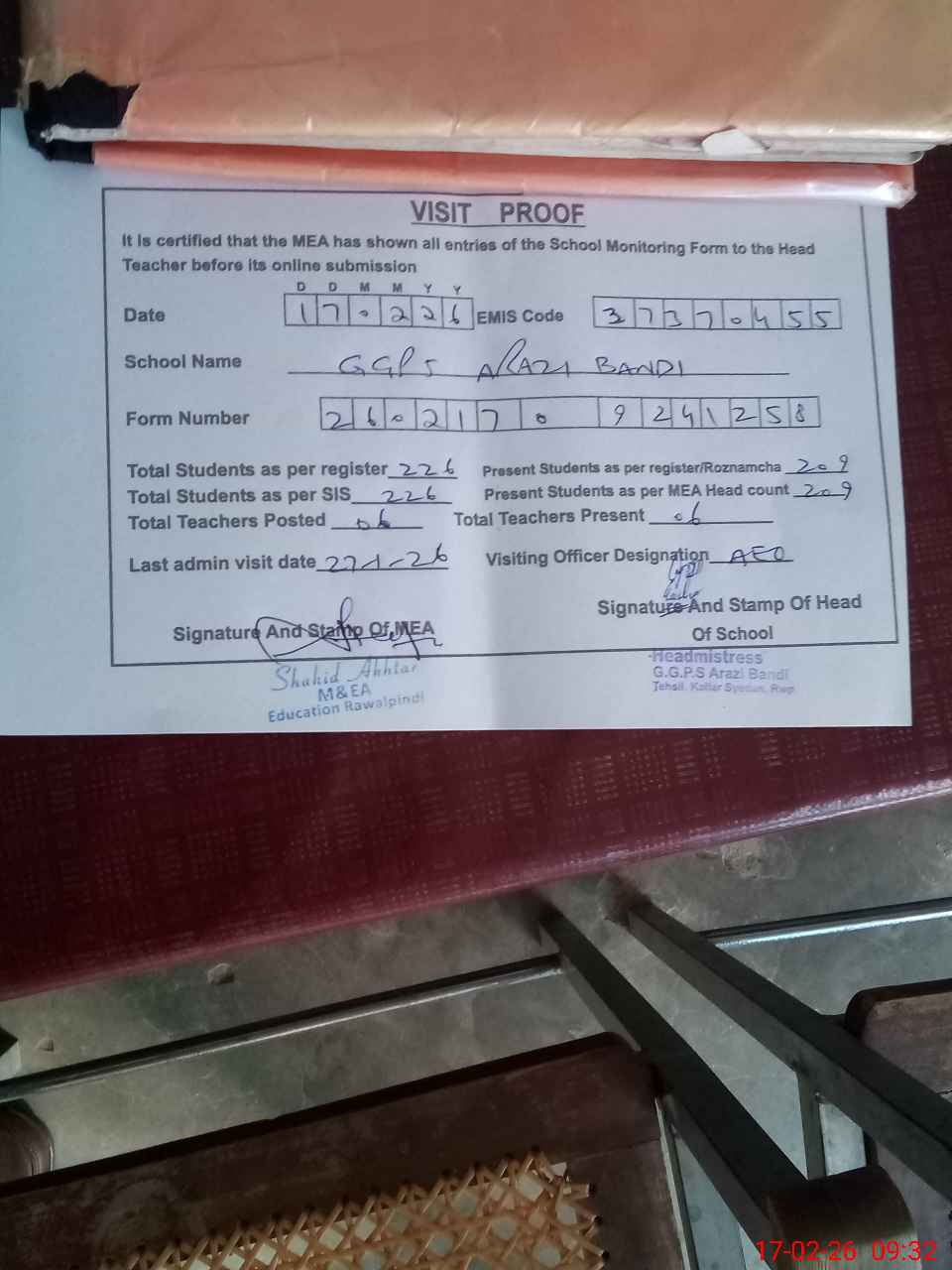 | Attendance Register | Head Teacher | MEA with School | Visit Proof |