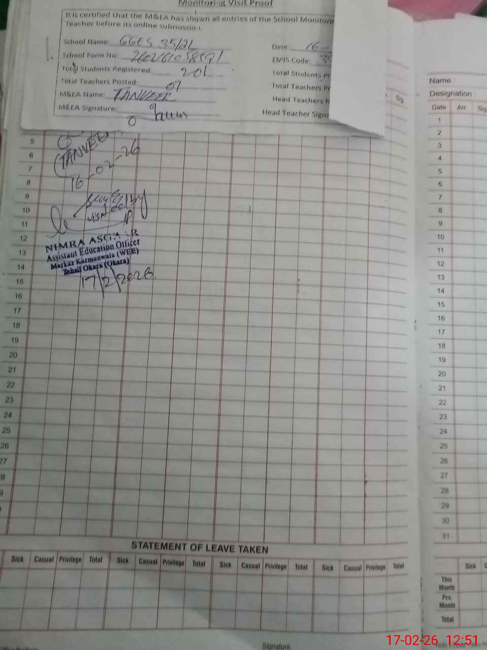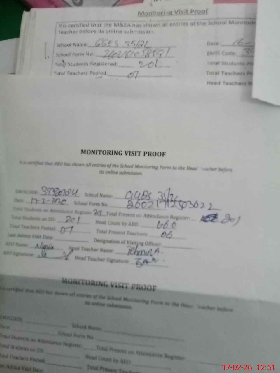 | Attendance Register | Head Teacher | MEA with School | Visit Proof |