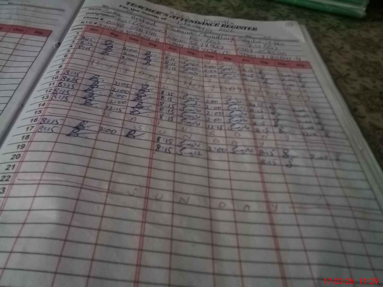 | CNIC | Full Name | Designation | R/C | Absence During Last Calender Month |