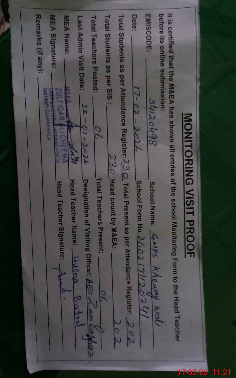 | EMIS Code: 34120498 | Name of School: GMPS KHEWAY WALI | |||